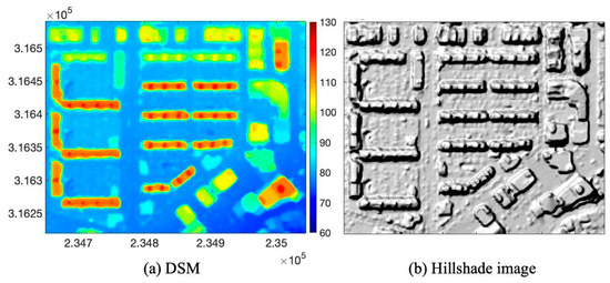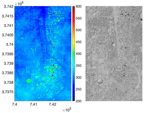 United States Geological Survey (USGS) 3DEP (3D Elevation Program) LiDAR data are used as reference heights for accuracy assessment with DSM results from WorldView-2 images (https://www.usgs.gov/3d-elevation-program/what-3dep, accessed on 4 September 2025). The LiDAR data were collected in 2018 and gridded into 1-m DSM (Figure 11). The LiDAR DSM is 9 years newer than the WorldView-2 images, so real surface height changes are expected between the two DSMs.