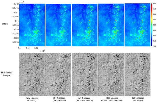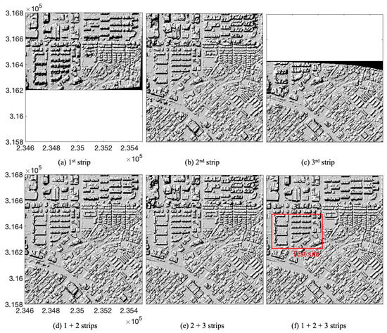 Furthermore, matching failures and interpolated MPs from each strip do not affect the quality of DSM in the combined result, as shown in Figure 21f, resulting in the best quality of DSM. This demonstrates the robustness and performance of SETSM MMP with the 3D KWHE algorithm in recovering and reconstructing 3D information from multiple images. Figure 22 shows hillshade images corresponding to the strip combinations. The test site in Figure 22f (red box) is selected for a detailed comparison between the quality of DSM in Figure 23 and the original DMC images in Figure 24. The six DMC images exhibit independent directions and amounts of relief displacement and occlusions. SETSM MMP extracts the best 3D object surface information from all the available images, minimizing surface roughness and noise, as shown in Figure 23b.
