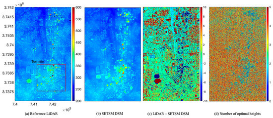 Comparison between SETSM DSM with six WorldView-2 images and the reference LiDAR DSM. The test site is selected for more detailed comparison over structures. SETSM DSM was created by the MAXAR imagery.
