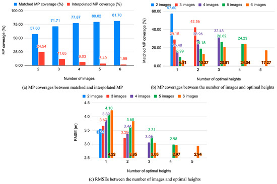 From six WorldView-2 images, five stereopairs are configured with a reference image of ID1. The reference image of ID1 has a minimum off-nadir angle of 7.50° and provides the most surface texture information among all the available images. Without GCPs, the relative RPC biases for all five stereopairs are compensated to remove image positioning biases and improve DSM quality. Figure 12 shows 1-m gridded WorldView-2 SETSM DSMs and the corresponding hillshade images according to the number of applied images, demonstrating the improvement in overall performance of SETSM MMP. When using only two images, stereopair SETSM fails to recover structures with small surface areas and tall heights, such as buildings. This is due to the reliance on a single observation and the SETSM blunder detection algorithm, which classifies sparsely distributed and highly peaked optimal heights among the 3D TIN as blunders during pyramid-level processing. The omission of optimal heights for the top edges of structures results in a reduced search height by TIN construction. Consequently, true heights for the objects are not detected in next-level processing, leading to failure in reconstructing these features in the final DSM. Adding more images in SETSM MMP increases the density of matched MPs with the final weighted optimal height (FWOHMP), resolving the issue of the reduced search-height problem and helping to detect true object positions with a denser distribution of matched MPs than in the single stereopair case. As shown in Figure 12c–e, all structures missing in (a) and (b) are successfully recovered. The large off-nadir angles of image IDs 5 and 6 cause them to have highly distorted object shapes and, respectively, 53% and 95% coarser GSDs than the ID 1 reference image. Despite these attributes, including these high off-nadir images, DSM production (Figure 12d,e) results in similar or improved quality of matching results. Thus, SETSM MMP mitigates the effects of the GSD differences and improves the quality of the DSMs without affecting the accuracy of the matched optimal heights. Height accuracy and matching success rate for each case are obtained from comparing the reference USGS LiDAR DSM, shown in Figure 13, with statistics plotted in Figure 14. The WorldView-2 images (2009) and reference DSM (2018) have a 9-year difference, reflecting significant surface changes in structures and vegetation. The temporal gap introduces errors in DSM quality assessment, particularly in height-difference RMSE calculations. To reduce the temporal errors, new and old buildings between the WorldView and reference DSM are manually filtered out, and the masked RMSE is calculated for a test site bounded in Figure 13a. Figure 13c illustrates these changes with a height difference map with a ±10 m scale bar, highlighting the most changed regions as red and blue scale color. The most notable change is the construction of the Atlanta Mercedes-Benz Stadium in August 2017, which is located in the southwest of Figure 13. The old Georgia Dome was successfully reconstructed in the SETSM DSM and disappeared in December 2016. Due to the viewing geometry limitations of the images, the northeast side of structures remains occluded and is interpolated in the final DSM. Smooth and continuous surfaces such as roads and parking lots show height differences within ±1 m, resulting in noiseless surfaces in the DSM hillshaded image. These effects are strongly related to the number of optimal heights as described in Figure 13d. Visible areas in all the images have the maximum number of optimal heights (five out of five stereopairs), whereas the occluded areas have mostly one or two optimal heights with falsely matched results from inappropriate search spaces. To minimize the discrepancy arising from actual surface changes and interpolated MPs in the accuracy statistics, MPs are selected only in areas with height differences within ±10 m. Matched and interpolated MPs are classified based on the presence or absence of the final weighted optimal height (FWOHMP). Interpolated MPs are those where FWOHMP estimation failed. The total ratio of MPs coverage within the height difference range is around 83% for all cases in Figure 12.