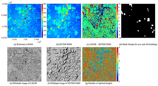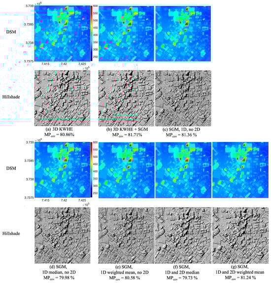 Figure 19 presents a quality comparison with 8-directional semi-global matching (SGM) cost aggregation into the SETSM workflow, introducing six additional scenarios: 3D KWHE with SGM (Figure 19b), SGM with integrated weighted optimal heights in 1D height-interval processing (Figure 19c), SGM with median and mean optimal heights in 1D height-interval processing (Figure 19d,e), and SGM with both median and mean values in 1D and 2D processing. Table 2 summarizes the quality statistics according to applied methods from (a) to (g) in Figure 19. Applying SGM without 2D kernel-based processing in SETSM reduces noise by increasing MPcov within 10 m and within 0 m to 2 m absolute height difference ranges by 3.16% and 3.69%, respectively (Figure 17c and Figure 19c). However, SGM alone cannot sufficiently suppress low-frequency surface noise on smooth surfaces and falls short of matching the quality achieved by the 3D KWHE method in SETSM. Among the SGM scenarios, using median and weighted mean optimal heights within 1D interval-height processing (Figure 19d,e) results in more blunders and noise, with both 3.20 m and RMSE and 79.98% and 80.58% MPcov, respectively. Ref. [14] proposes an SGM 1D weighted mean approach with median values to fuse multiple disparities such as Figure 19e. With additional 2D processing in the weighted mean approach, surface noise and blunders are more reduced than without 2D processing, improving RMSE by 0.06 m and MPcov by 0.66%. In contrast, integrating 3D KWHE with SGM (Figure 19b) results in the best performance, improving DSM quality and increasing MPcov within 10 m and within 0–4 m height differences by 0.85% and 0.76%, respectively, and achieving a similar RMSE of 3.10 m. These results demonstrate that the proposed 3D KWHE enhances DSM quality in terms of edge preservation and surface noise reduction compared to the SGM-only approach. Additionally, combining SGM with 3D KWHE can further improve DSM quality in the SETSM workflow with approximately 3% increased processing time.