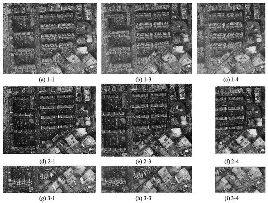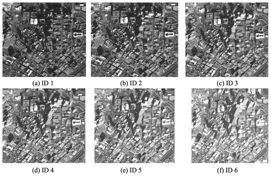 As shown in Table 1, the six WorldView-2 images have various GSDs ranging from 0.47 m to 0.92 m based on off-nadir angles, indicating twice the difference between the smallest and the biggest GSD. These discrepancies in GSDs result in mismatched texture information during pixel-to-pixel similarity measurement between image patches extracted using the same kernel size. Results derived from these data, therefore, provide a test of the performance of the developed algorithm to mitigate the effects of variable GSDs. The images were captured over the US city of Atlanta on 22 December 2009, as illustrated in Figure 8. The image with the smallest off-nadir angle (ID 1) was selected as the reference image for configuring stereopairs with others, resulting in a total of five stereopairs configured with convergence angles of 15.1°, 26.0°, 35.2°, 42.3°, and 51.5°, respectively. The test region was chosen over Atlanta’s tech square and hotel district, as shown in Figure 9. The off-nadir viewing angles are oriented toward the northeast, causing most buildings’ northeast sides to be predominantly occluded.