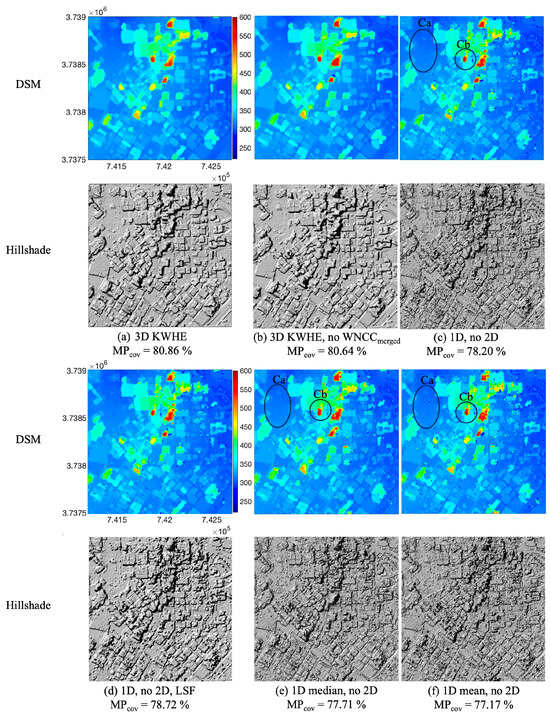 Quality comparison according to applied methods. In this figure, (a) is the 3D KWHE result, and (b) is the 3D KWHE result without the merged WNCC observation. (c–f) are the results without 2D kernel-based processing; (c) applies only the 1D height-interval processing; (d) is the LSF applied result with 1D height-interval processing; and (e,f) apply the final optimal heights from median/mean values among all optimal heights from stereopairs, respectively.