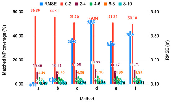 Quality statistics according to applied methods from (a) to (f) in Figure 17. The MPcov is separated by absolute height difference range with a 2 m interval: ‘0–2’, ‘2–4’, ‘4– 6’, ‘6–8’, and ‘8–10’.
