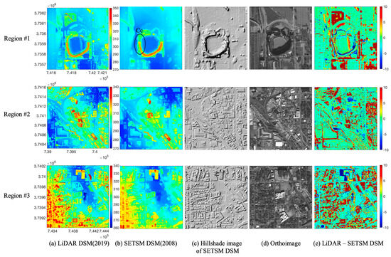 To further demonstrate the quality comparison, three additional regions with approximately 80 m elevation ranges were selected as shown in Figure 20, which includes the LiDAR DSM (2018), the SETSM DSM (2009), a hillshade image of the SETSM DSM, the orthoimage, and a height difference map between the LiDAR and SETSM DSMs. In region #1, the shape and outline of the Center Parc Stadium were successfully reconstructed, despite the infields being obscured due to shadows. However, the upper section of the stadium indicated by Cc in Figure 20b was not fully reconstructed. Surface changes are clearly identifiable in the height difference map, highlighting the transformation of a baseball field into a soccer stadium and allowing the measurement of newly planted trees’ heights. In regions #2 and #3, all built features are accurately extracted, with well-preserved edge information and effectively suppressed surface noise. The change detection map in Figure 20e reveals surface changes over the 9-year period, including newly built structures and vegetation growth.