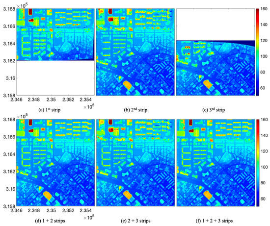 DMC images are captured by a frame sensor with central projective geometry. Due to the radial direction of relief displacements and occlusions inherent in central projection, the surface visibility of each image depends on the locations of projection centers. The reference images of MPs are individually decided by the locations of MPs and projection centers. To maximize image visibility, a reference image for each MP is selected based on the minimum distance between the projection center of the image and the image position projected from the 3D voxel coordinates of the MP. Given the complexity of image geometry, DMC images are utilized to demonstrate the ability of SETSM MMP to recover occlusions. Figure 21 shows 0.5-m gridded SETSM DSMs, extracted from the DMC image set, according to combinations of strip data. Each strip has individual lines of projection centers: north for the first strip, center for the second strip, and south for the third strip. Figure 21a–c illustrates the matching failures and the interpolated MPs caused by occlusions, corresponding to the locations of projection centers. By combining the first and second strips in Figure 21d, the northern regions that failed to recover surface information from the second image strip are successfully reconstructed with ground and building surfaces by utilizing the first strip’s image textures to recover the occlusions. Similarly, the problematic surfaces in the northern regions of the third strip are clearly reconstructed using the second strip’s images, as shown in Figure 21e. With the combination of all three strips, all the visible surfaces from all the applied images are successfully recovered, eliminating loss due to occlusions. Table 3 presents the occlusion recovery statistics for each strip after strip combination. The percentage of occlusion recovery is calculated as the ratio of occlusion grids recovered by the combined strip to the total number of grids in each strip. When all three strips are combined, the occlusions are recovered by 22.40%, 17.36%, and 14.29% for each strip of 1, 2, and 3, respectively, corresponding to the central perspective view direction, and the recovery results are propagated from the pairwise combinations of the first and second strips and the second and third strips.