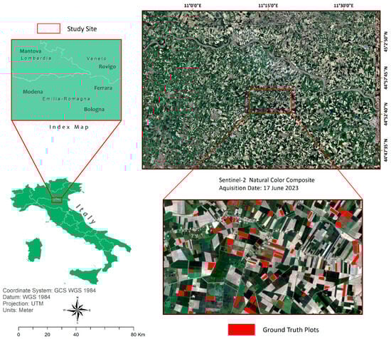 The climatic conditions prevailing in the Italian landscape make it suitable for diverse agricultural practices over the different parts of the country. The study area covers approximately 22,446 km2, and is in northern Italy, mainly in the Emilia-Romagna region and extending into parts of Lombardy and Veneto regions, important agricultural zones (Figure 1). This territory has a temperate climate that is favorable to cultivating a variety of crops such as wheat, maize, sugar beet, and vineyards, which are pivotal for local consumption as well as export [60]. It has hot, humid summers and cold, foggy winters, with summer temperatures averaging between 25 and 30 °C and winter temperatures between 0 and 5 °C, with occasional snowfall. Mean annual rainfall ranges from 600 to 1000 mm, mostly falling in autumn and spring, supporting both rain-fed as well as irrigated agriculture.