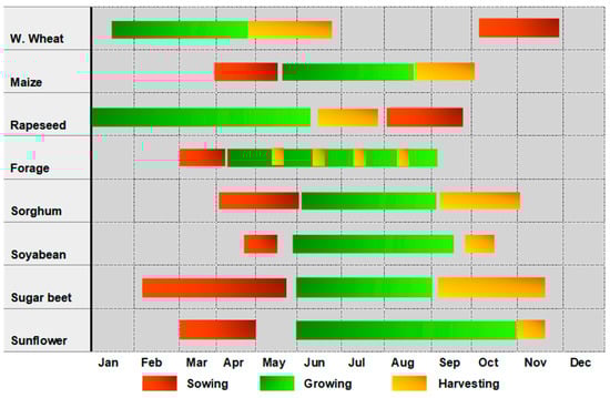 Agricultural activities follow a structured seasonal calendar, differentiating winter and summer crops [61]. Winter crops, such as wheat and rapeseed, are typically sown in October and November. Wheat grows from February to April and is harvested between May and June, while rapeseed matures from October to mid-June, with harvesting occurring in late June through July. Summer crops, including maize and soybeans, are planted from early to mid-spring. Maize reaches its peak growth by late July and is harvested from late August to September, while soybeans are collected from late September to mid-October. Forage crops for crop-livestock systems are sown in March or early April, with multiple harvests occurring from May to August. Sorghum and sunflowers, planted in spring, are harvested in autumn; sugar beet, sown between February and May, follows a flexible growth schedule with staggered harvesting periods. The precise scheduling of crop cycles facilitates effective crop rotation and enhances agricultural management within the region (Figure 2).