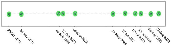 Bottom-of-Atmosphere (BOA) Level 2A products, including data for tile ID T32TPQ, were accessed via the Copernicus program’s recently launched “European’s Eyes on Earth” platform https://browser.dataspace.copernicus.eu (accessed 14 December 2024). The study utilized multitemporal data corresponding to key crop growth stages, sowing, growing, and harvesting spanning the period from November 2022 to August 2023. Only imagery with less than 5% cloud coverage over the study area was included in the analysis (Figure 3). For spectral feature preparation, the 10 most relevant bands from each date were selected to ensure robust representation of crop dynamics. Figure 4 illustrates the spatial resolution and wavelengths of Sentinel-2 bands used in this study.