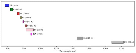 The Sentinel-2 mission, part of the European Earth observation program, is equipped with the Multispectral Instrument (MSI), which captures vital data across 13 spectral bands, spanning visible light, near-infrared, and shortwave infrared wavelengths [62]. Operating as a constellation with two satellites, Sentinel-2A and Sentinel-2B, the mission delivers critical information for agricultural monitoring, achieving a revisit interval of approximately five days [63,64].
