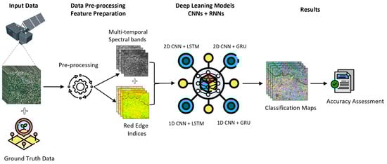 The workflow of this study carried several steps, including satellite image preprocessing, time-series feature extraction, deep learning model development, classification, and result evaluation (Figure 5). Based on the prepared features, which include spectral bands and vegetation indices, four distinct deep learning models were designed: (i) 1D CNN-LSTM, (ii) 1D CNN-GRU, (iii) 2D CNN-LSTM, and (iv) 2D CNN-GRU. These models were developed to effectively use the spatial and temporal characteristics of the data for improved crop classification.