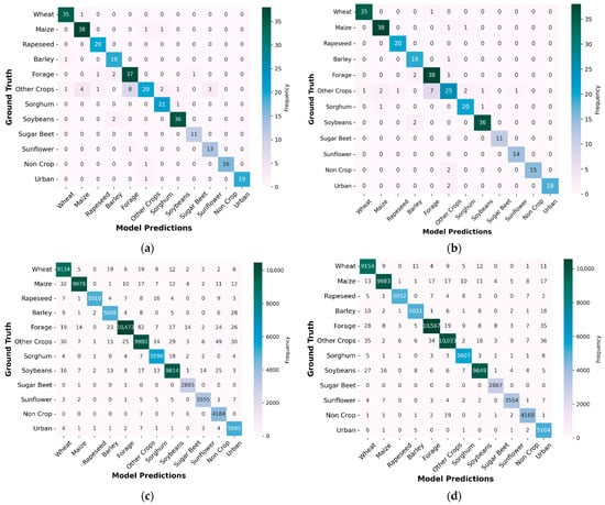 Efficient crop mapping with high spatial and temporal resolution can inform effective resource allocation and support food security by providing timely data on crop distribution and conditions [8,9]. Earth Observation (EO) refers to the acquisition of information about the physical, chemical, and biological properties of the Earth using satellites, airborne, and in situ sensors [10,11]. This remotely sensed data offers cost-effective and reliable measurements on a global scale, significantly reducing the reliance on ground surveys and traditional data collection methods [12,13]. Achieving the United Nations Sustainable Development Goal of “Zero Hunger” requires innovative strategies for monitoring and managing agricultural systems [14]. In this context, EO data has emerged as a vital resource in precision agriculture [15], offering timely, large-scale, and detailed insights into crop health, yield, and land use [16,17].
