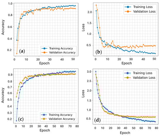 For the 1D CNN + LSTM/GRU models, the input data consists of 2071 samples with a shape of (2071, 11, 14), representing 11-time steps and 14 spectral features per sample, such as spectral bands or vegetation indices. For the 2D CNN + LSTM/GRU model, 16 × 16 spatial patches are extracted for each polygon over 11-time steps, with 14 features. The batch sizes of 16, 32, 64, and 256 are tested to identify the optimal batch size for efficient training. To address class imbalance, class weights are applied during training, ensuring minority crop classes receive adequate focus. To address class imbalance, we re-weight the loss using scikit-learn’s balanced class weights, computed on the training split and supplied via Keras’ class_weight argument. This preserved the original spectral temporal signatures while proportionally emphasizing underrepresented crop types. All models are compiled using the Adam optimizer and the sparse categorical cross-entropy loss function [86], suitable for multi-class crop classification [42,87]. Training is conducted for a maximum of 100 epochs, with early stopping monitoring the validation loss and halting training if no improvement is observed for 5 consecutive epochs. A ReduceLROnPlateau callback dynamically reduces the learning rate by a factor of 0.5 if the validation loss plateaus, promoting smoother convergence. Model checkpoints ensure that the best-performing model is saved for evaluation. This robust training setup efficiently captures temporal and spatial crop patterns while mitigating overfitting and handling class imbalance.