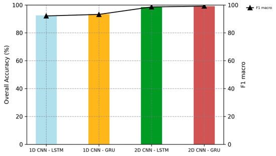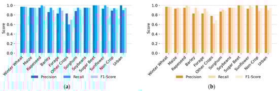To evaluate the performance of the proposed 1D CNN + LSTM/GRU and 2D CNN + LSTM/GRU models, overall accuracy (OA) and F1 macro are employed as the primary metrics for assessing overall model performance. For per-class analysis, precision, recall, and F1 score are additionally reported to assess classification performance at the crop-type level. Precision measures how many of the predicted crop samples were correctly classified, indicating the accuracy of positive predictions made by the model. Recall assesses the model’s ability to identify all actual instances of a crop type within the dataset, ensuring it captures the correct samples. The F1 score, being the harmonic mean of precision and recall, provides a balanced assessment, particularly in the presence of class imbalance. Overall accuracy calculates the proportion of correctly classified samples across all crop types, offering a comprehensive view of the model’s performance. Additionally, confusion matrices are generated to help analyze misclassification patterns and identify areas where the model may need improvement. The formulas for overall accuracy and F1 macro are provided below: