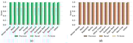 The integration of the time series of Sentinel-2 spectral data and vegetational indices has been crucial in improving crop classification accuracy [33]. These data sources, particularly red edge, shortwave infrared, and vegetational indices, provide diverse spectral information that enhances the ability to distinguish between different crop types [34,35]. The red-edge band is pivotal in capturing subtle spectral variations associated with crop types, making it vital for effective crop discrimination [36]. By providing detailed information on green vegetation growth, this band serves for the development and application of various red-edge-based vegetation indices, which are critical for monitoring agricultural farmlands [37].