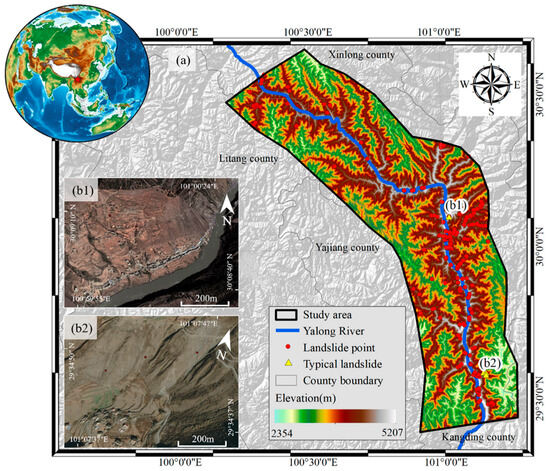 (a) Study area location. (b1,b2) Typical landslide area imagery (Source: Google Earth).