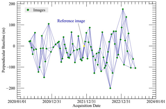 During interferometric processing, temporal and spatial baselines were constrained to ≤90 days and 160 m, respectively. Figure 2 illustrates the spatial–temporal baseline distribution of the interferometric pairs.