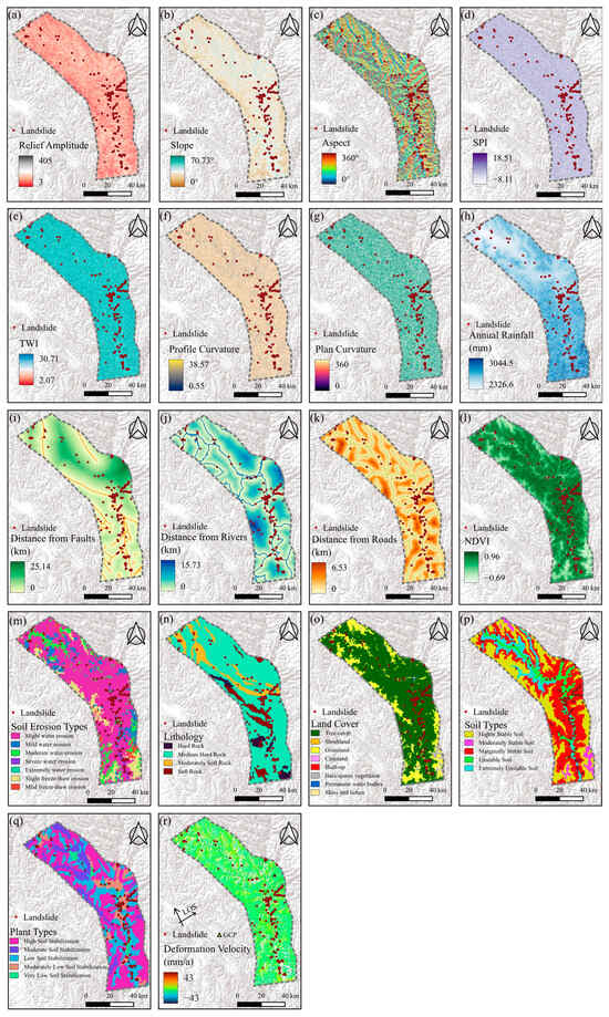 Illustrative maps of the landslide susceptibility factors location of the study. (a) Relief Amplitude. (b) Slope. (c) Aspect. (d) SPI. (e) TWI. (f) Profile Curvature. (g) Plan Curvature. (h) Annual Rainfall. (i) Distance from Faults. (j) Distance from Rivers. (k) Distance from Roads. (l) NDVI. (m) Soil Erosion Types. (n) Lithology. (o) Land Cover. (p) Soil Types. (q) Plant Types. (r) Deformation Velocity.