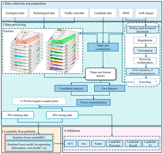 In this context, Interferometric Synthetic Aperture Radar (InSAR) has emerged as a key tool for dynamic LSA, offering millimeter-level deformation accuracy and multi-temporal coverage [40,41,42]. With technological advances, InSAR has evolved from a post-event validation tool to a core component of susceptibility modeling, enabling the shift from static mapping to dynamic simulation [43,44]. Recent studies have explored its integration into LSA frameworks [45,46,47]. For instance, Chen et al. (2023) [48] and Zhu et al. (2025) [49] enhanced deformation datasets and applied dynamic weighting; Dai et al. (2023) [50,51] and Zhou et al. (2025) [52] combined InSAR with slope units to construct deformation–hazard matrices; Li et al. (2024) [53] and Wang et al. (2024) [54] achieved higher accuracy in cold regions by integrating multi-track deformation with machine learning models.