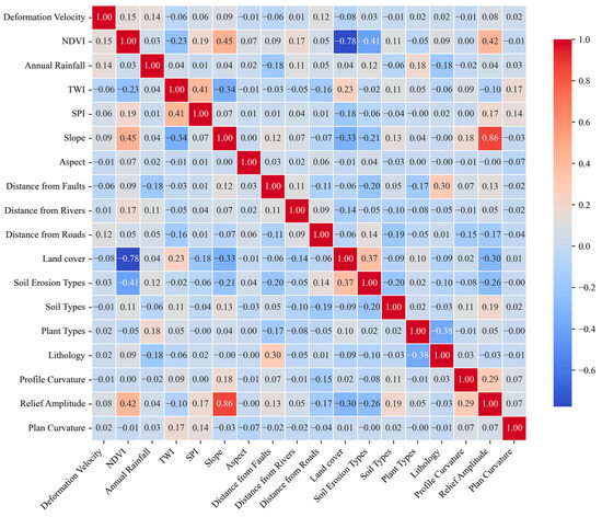 In this study, the Pearson correlation coefficients for the 18 conditioning factors (as described in Section 2.3) are summarized in Figure 5. The analysis revealed that land use and NDVI exhibited a strong negative correlation (r = −0.78), while topographic relief and slope showed a high positive correlation (r = 0.86). These two pairs indicate significant redundancy and may warrant the exclusion of one variable from each pair in subsequent modeling. All other factor pairs exhibited correlation coefficients with absolute values below 0.5.
