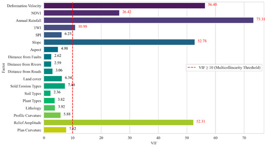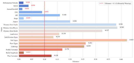 Provides an inverse measure of collinearity, with TOL values below 0.1 generally indicating problematic collinearity. This step ensures that the final set of variables used in the susceptibility modeling process exhibits acceptably low linear dependence, thereby enhancing the robustness and interpretability of the model outputs. Six factors, including Annual Rainfall, Deformation Velocity, Slope, Relief Amplitude, NDVI, and TWI, did not meet the multicollinearity criteria based on VIF and TOL analyses (Figure 6 and Figure 7), and were subsequently subjected to further evaluation using the Geodetector-based factor detection method.