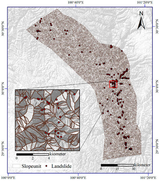 Slope units were delineated using the r.slopeunits module in GRASS GIS [58]. This algorithm utilizes digital elevation model (DEM) data and applies morphometric watershed segmentation combined with slope aspect homogeneity constraints to partition geomorphologically coherent natural slope boundaries. Compared to conventional raster-based units, this method reduces intra-unit terrain variance, enhances sensitivity to key landslide-controlling factors, and improves both the spatial reliability and interpretability of susceptibility mapping results.