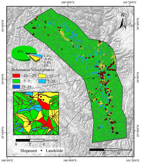 In response to the above limitations, this study proposes a dynamic landslide susceptibility framework that integrates SBAS-InSAR-derived deformation velocity, geographical detector-based interaction analysis, and optimized slope unit partitioning. Focusing on a typical landslide-prone area in the middle and lower reaches of the Yalong River, annual deformation velocity fields (2020–2023) were extracted from ascending Sentinel-1 imagery. These were incorporated into a multi-source model alongside conventional static predictors. A Random Forest model was then applied to quantify the predictive value of deformation features, supported by SHAP (SHapley Additive exPlanations) interpretation and geographical interaction analysis, providing insights into the compound triggering mechanisms of landslides in complex alpine environments.