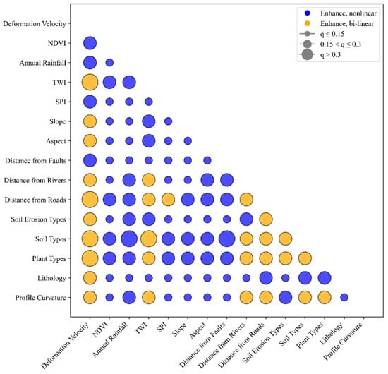 To quantitatively assess the explanatory power of each factor on landslide susceptibility, this study employs the Factor Detector and Interaction Detector modules from the GeoDetector toolset [59]. The Factor Detector computes the explanatory power (q-value) of an independent variable X on a dependent variable Y, reflecting the extent to which the spatial variance in Y can be attributed to X. The formula is expressed as
