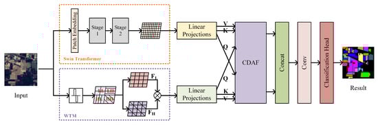 The proposed Wavelet-Enhanced Swin Transformer with a Cross-Domain Attention Network (WSC-Net) is designed to accurately classify HSI by synergistically fusing multi-scale contextual information with fine-grained detail features. As illustrated in Figure 1, the architecture is structured as a dual-branch network. This process begins with data preprocessing, followed by two parallel feature extraction streams: a two-stage Swin transformer backbone for contextual features and a Wavelet Transform Module (WTM) for frequency-domain details. The core innovation lies in our Cross-Domain Attention Fusion (CDAF) module, which intelligently integrates features from both branches before a final classification head produces the land-cover predictions.