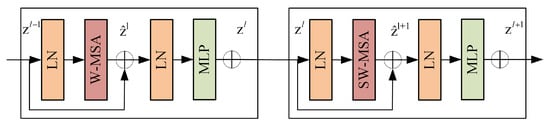A pair of consecutive Swin transformer blocks is the fundamental computational unit. As illustrated in Figure 2, this pair comprises a block with Window-based Multi-head Self-Attention (W-MSA) and another with Shifted-Window-based MSA (SW-MSA). This design allows for efficient local attention computation within non-overlapping windows of size , while the shifting mechanism enables cross-window information flow, which is crucial for building a global receptive field. The process for two consecutive blocks (l and ) is formulated as follows: