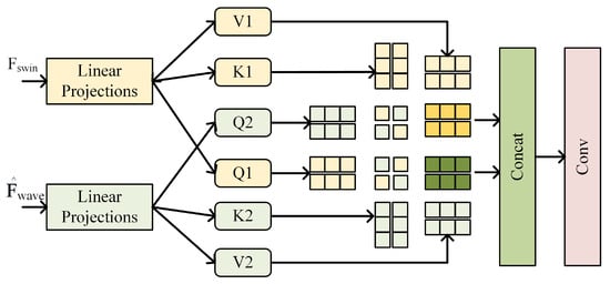 The module takes the Swin transformer output () and the aligned wavelet features () as inputs. For compatibility with the attention mechanism, both feature maps are first flattened from their 2D spatial format to 1D sequences of tokens, resulting in a shape of (where ). Following this, the reshaped features are projected to Query (Q), Key (K), and Value (V) spaces using separate learnable linear projections, and as follows: