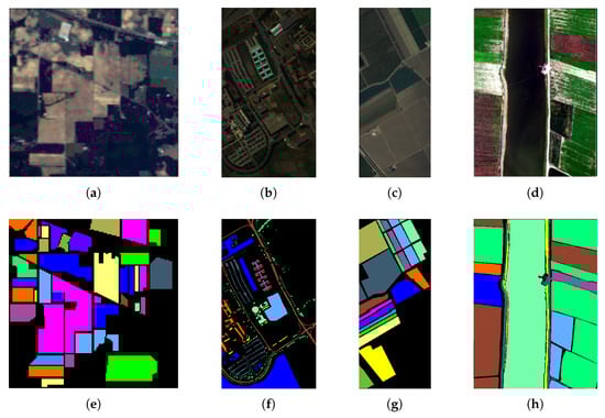 Overview of the four experimental datasets. The top row (a–d) displays the false-color images, and the bottom row (e–h) shows the corresponding ground-truth maps. From left to right: (a,e) Indian Pines, (b,f) Pavia University, (c,g) Salinas, and (d,h) Longkou.