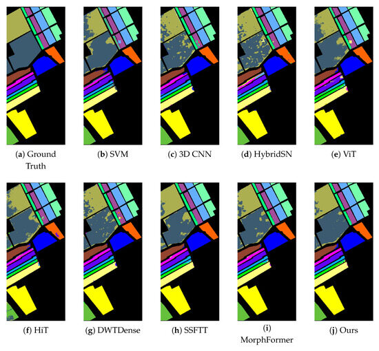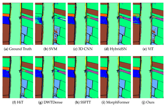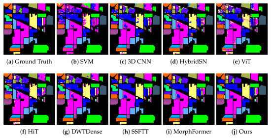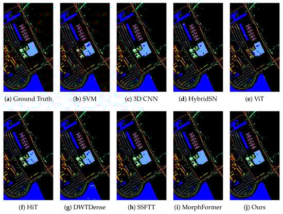 To thoroughly validate the effectiveness of the proposed method, we conducted a comprehensive comparative analysis against eight representative methods. These baselines were carefully selected to cover the main technological paradigms in HSI classification, including Support Vector Machines (SVMs) [12], 3D CNNs [22], the Hybrid Spectral–Spatial Network (HybridSN) [24], Vision Transformer (ViT) [32], the Hyperspectral Image Transformer (HiT) [52], Discrete Wavelet Transform and Dense CNN (DWTDense) [53], the Spectral–Spatial Feature Tokenization Transformer (SSFTT) [54], and the Spectral–Spatial Morphological Attention Transformer (MorphFormer) [55]. All the methods were implemented under the same experimental conditions for a fair and rigorous comparison.