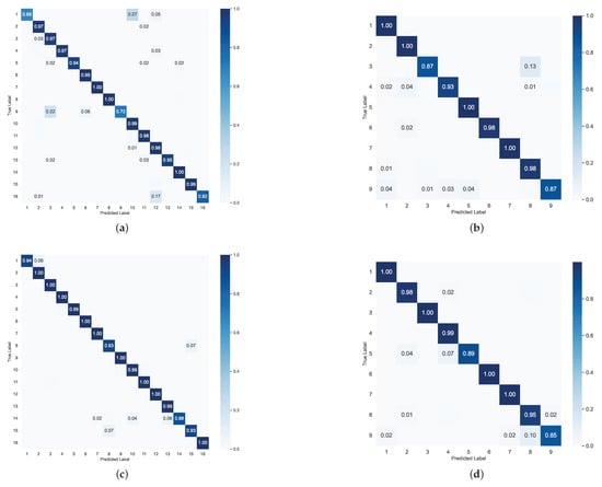 Normalized confusion matrices of the proposed WSC-Net in the four datasets: (a) IP, (b) PU, (c) SA, and (d) LK. The diagonal values represent the per-class recall rates.