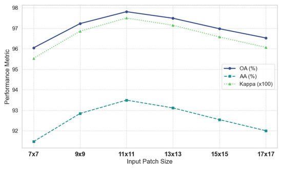 To ensure a fair comparison and reproducibility, all the experiments were conducted within a unified framework on a single NVIDIA Tesla V100 GPU using the PyTorch 1.12.1 framework. For data preparation, we first applied PCA to each HSI cube to reduce its spectral dimensionality, setting the number of principal components at 30 for the IP, SA, and LK datasets and at 15 for the PU dataset. These values were chosen based on common practice to retain over 99% of the spectral variance while reducing the computational overhead. From these reduced data cubes, spatial patches of size 11 × 11 were extracted around each labeled pixel to form the input for the networks. This patch size was determined to be optimal through a dedicated ablation study (Section 3.6), which balances the need for sufficient spatial context with the risk of introducing noise from irrelevant neighboring pixels. The training set for the IP dataset consisted of 5% of the samples from each class. For the SA, PU, and LK datasets, the training sets were composed of 0.5%, 1%, and 5% of the samples per class, respectively. These challenging, small-sample ratios were selected to rigorously test the model’s generalization capability. The remaining samples in each dataset were used for testing.