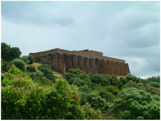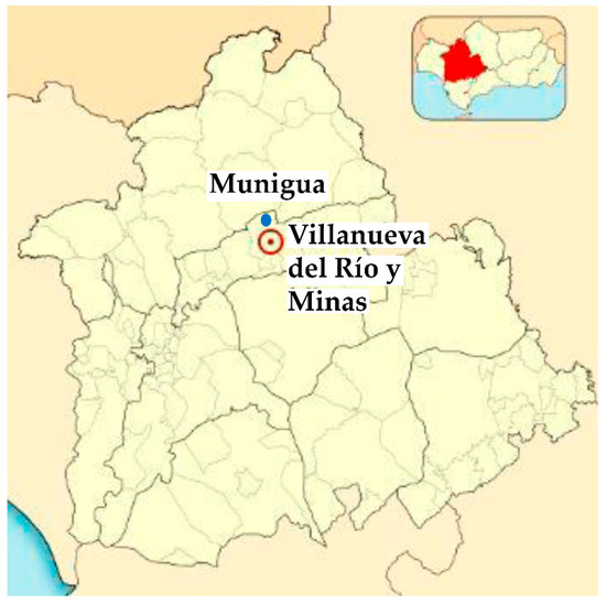 The archeological site of Munigua, also known as Mulva, is located approximately 8 km from Villanueva del Río y Minas and 50 km northeast of Seville (Spain) (Figure 1). The southern region of the Sierra Morena is historically significant due to its former mining activity [21,22,23]. Known in antiquity as Municipium Flavium Muniguense, the town flourished due to its proximity to mineral resources, particularly iron and copper, which were extensively exploited in the area.
