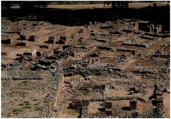 Systematic excavations led by the German Archeological Institute since 1956, initially under Wilhelm Grünhagen and later under Thomas G. Schattner and collaborators, have provided extensive data on Munigua’s topography, architecture, and economy [20]. Recent research has focused on generating a detailed three-dimensional reconstruction of the city and understanding the spatial and functional relationships among its structures [25] (Figure 3). The site also provides insights into various economic activities, such as iron metallurgy, quarrying, olive cultivation, and animal husbandry, which sustained both urban and rural populations within its territory [22].
