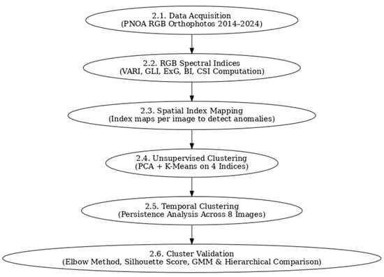 This study employed a remote sensing-based approach using high-resolution RGB orthoimagery from the National Aerial Orthophotography Plan of Spain (PNOA, from the Spanish ‘Plan Nacional de Ortofotografía Aérea’) [36] to detect and monitor potential archeological features. The methodology (Figure 4) integrates spectral index computation, unsupervised clustering, and temporal analysis to identify persistent anomalies that may signal buried structures or anthropogenic disturbances.