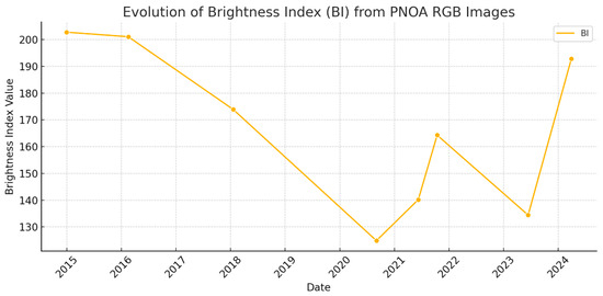 Temporal evolution of the Brightness Index (BI) from PNOA RGB images (2014–2024).