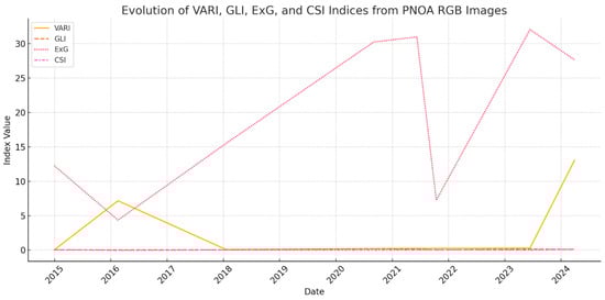Temporal evolution of VARI, GLI, ExG, and CSI indices from PNOA RGB images (2014–2024).