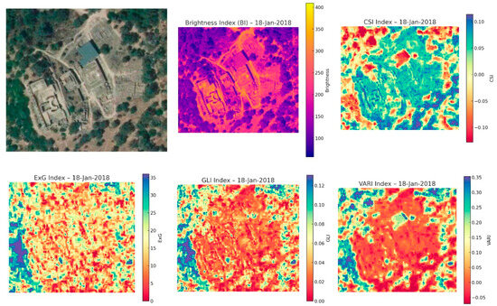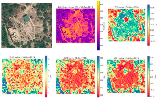 - 30 December 2014: High values of BI and moderate ExG were detected in open and clear areas, suggesting minimal vegetative cover and high surface reflectance, possibly due to exposed architectural elements;