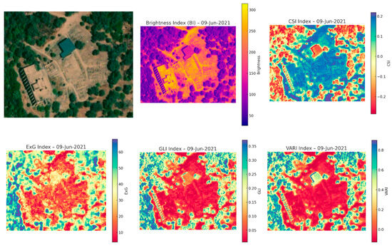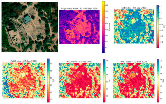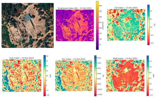 The indices VARI and GLI (Figure 6), designed to highlight vegetation vigor using green channel dominance, presented strong seasonal variability. Peaks were recorded during the spring acquisition (28 March 2024), while lower values appeared in mid-to-late summer images (e.g., 13 June 2023). These indices effectively captured phenological changes and were useful in isolating non-vegetated surfaces where archeological anomalies are more likely to manifest. Notably, areas with persistently low VARI and GLI and high BI and CSI values tended to correspond with known excavation zones or structures partially exposed on the surface.