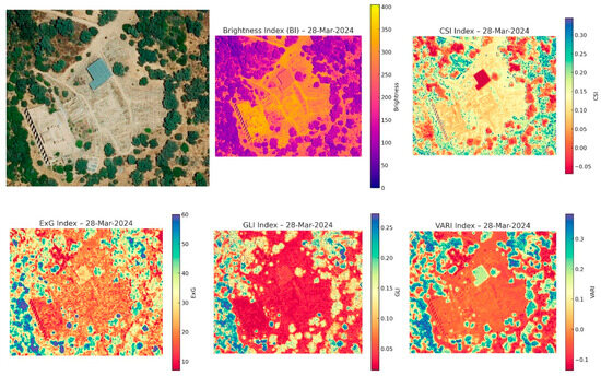 - 28 March 2024: The VARI index showed its highest peak, reflecting lush vegetation growth in early spring, with corresponding low CSI and BI values in vegetated sectors. However, certain zones retained high BI and CSI values, potentially due to the presence of stone surfaces or compacted soils.