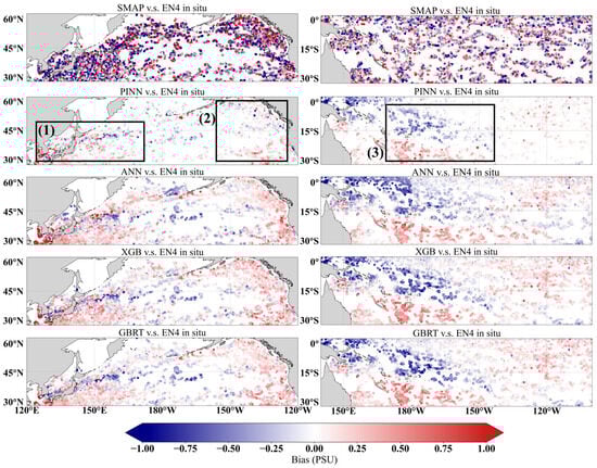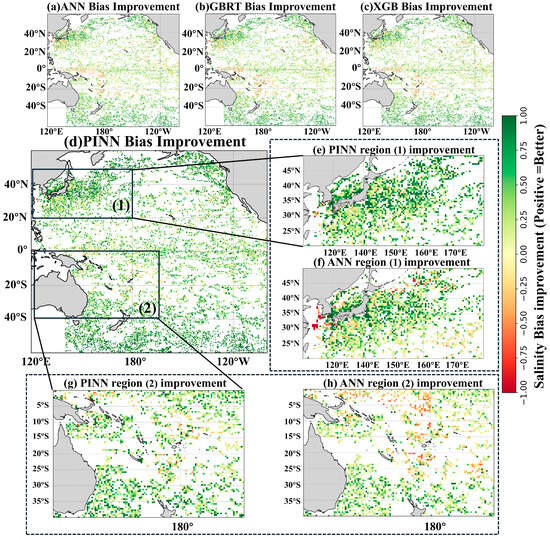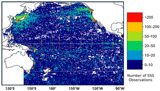 The spatial domain encompasses the Pacific Ocean region (60°S–60°N, 110°E–80°W), representing the world’s largest ocean basin. The Pacific Ocean was selected as the study region due to its critical role in global climate regulation through hosting the El Niño-Southern Oscillation (ENSO), which drives significant salinity variability and provides diverse testing conditions for algorithm development [24]. The basin exhibits complex salinity dynamics with distinct variability modes spanning from decadal to global warming-related timescales [25], while its vast spatial extent encompasses diverse oceanographic conditions essential for developing robust SSS bias correction methodologies [26]. Additionally, the Pacific’s dominant influence on ocean-atmosphere interactions and climate variability makes accurate SSS measurements particularly critical for operational forecasting applications [7,25,27].