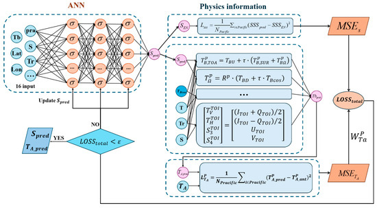The PINN model integrates radiative Transfer physics with neural network optimization through a forward physics model that calculates theoretical brightness temperature from salinity values, followed by a multi-component loss function that ensures both physical consistency and data accuracy. The derivation begins with the Radiative Transfer Model (RTM) from Meissner & Wentz [23,29], which combines the formulation of radiative transfer and systematic simplifications needed to accurately represent surface emissivity, including corrections for wind-induced roughness. This foundational framework progresses through the application of a Stokes vector to describe the combined polarization state of the received signal at the Top of Atmosphere (TOA), facilitating a detailed analysis of the signal’s polarization characteristics, while also transitioning the Stokes vector measured at the Earth’s surface to the TOI brightness temperature vector, accounting for specific gain characteristics of the satellite system and contributions from galactic radiation. The process culminates in the optimization of a multi-component loss function, ensuring that the model maintains both physical consistency and accuracy in its salinity predictions. In the equations that follow, the superscript P indicates the polarization state of the respective elements.