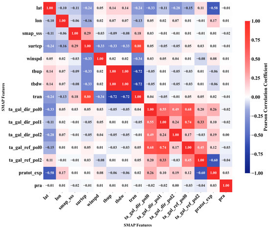 Pearson Correlation Coefficient Heatmap of the model input parameters. (The element ta_gal_ref_pol1 shows values of 0 across all correlations, indicating no meaningful relationship with other SMAP elements and can therefore be excluded from further analysis.).