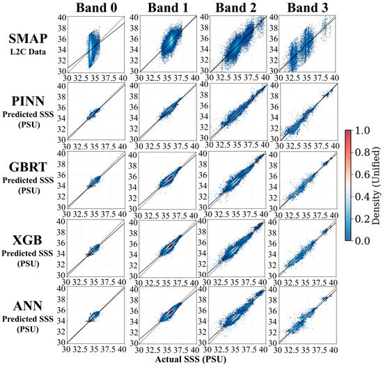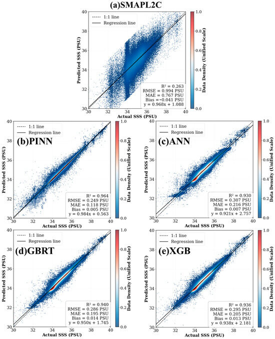 Recognizing these fundamental limitations, advanced computational approaches have been increasingly adopted for bias correction and accuracy enhancement of satellite-derived SSS products. Within empirical modeling frameworks, machine learning methodologies have been demonstrated as effective approaches for improving satellite SSS Bias Correction, as these algorithms can identify and model complex nonlinear relationships between environmental variables and SSS [8]. Fundamental improvements in satellite data processing have also contributed to enhanced SSS accuracy, with Boutin et al. [7] demonstrating systematic error reduction in SMOS SSS retrievals through relaxed filtering in high natural salinity variability regions and correction of seasonally varying latitudinal systematic errors and improved variability representation. Several notable contributions have been made in developing machine learning-based correction schemes for Level-3 SSS products. Jang [9] developed a comprehensive global SSS bias correction utilizing seven machine learning approaches—including k-nearest neighbors, support vector regression, artificial neural network, random forest, and gradient boosting methods—achieving significant enhancement of SMAP Level-3 Bias Correction accuracy with strengthened correlation to in situ data across global oceanic regions. Similarly, precipitation-based correction methodologies have been implemented by Qin et al. [10], who employed precipitation data to correct latitude-dependent biases in SMAP SSS estimates. The superiority of ensemble methods has been further validated by Rajabi-Kiasari and Hasanlou [11], who demonstrated that gradient boosting machines and random forest methods exhibited superior performance compared to conventional approaches in SSS bias correction applications. Recent advances have expanded machine learning applications to region-specific SSS improvements and advanced classification methodologies. Savin et al. [12] achieved substantial accuracy improvements in Arctic Ocean SSS retrieval through ensemble machine learning approaches, while Song et al. [13] developed light gradient boosting models specifically for coastal region SMAP SSS retrieval. Furthermore, contemporary methodologies have evolved beyond conventional supervised frameworks, with Ouyang et al. [14] implementing unsupervised classification algorithms to characterize SMAP Level-3 SSS bias distributions and identify systematic mid-latitude biases. Buongiorno et al. [15] applied support vector machines for regional bias reduction and the development of multi-sensor fusion algorithms combining SMOS and SMAP observations.