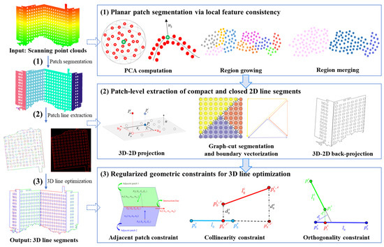 The proposed approach takes scanning point clouds of building structures as input and it outputs parameterized 3D line segments to characterize the outline of buildings. Figure 1 shows the pipeline of the proposed method, which consists of three main stages: