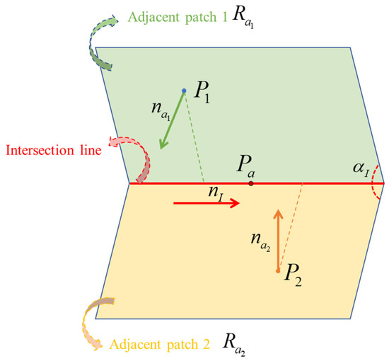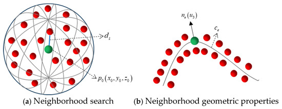 where denotes the angle between the normal vectors of and , serving to constrain the angular deviation between the seed point and candidate points, defines the orthogonal distance from the candidate point to the neighborhood plane along the normal direction of the seed point, with a value set to , and is set to adaptively determining the distance threshold between the seed point and candidate points.