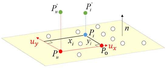 To achieve geometric region clustering for point clouds, we first implement principal component analysis (PCA) [59] to compute geometric features and provide clustering constraints for region growing. Specifically, KD-trees are constructed for neighborhood indexing, followed by the computation of the covariance matrix for each point’s neighborhood. The PCA algorithm is then applied to derive the eigenvalues , and (), and their corresponding eigenvectors , and , characterizing the geometric properties of the point neighborhood. The eigenvector associated with the smallest eigenvalue represents the normal vector of the local neighborhood of the point, while the neighborhood curvature is defined as